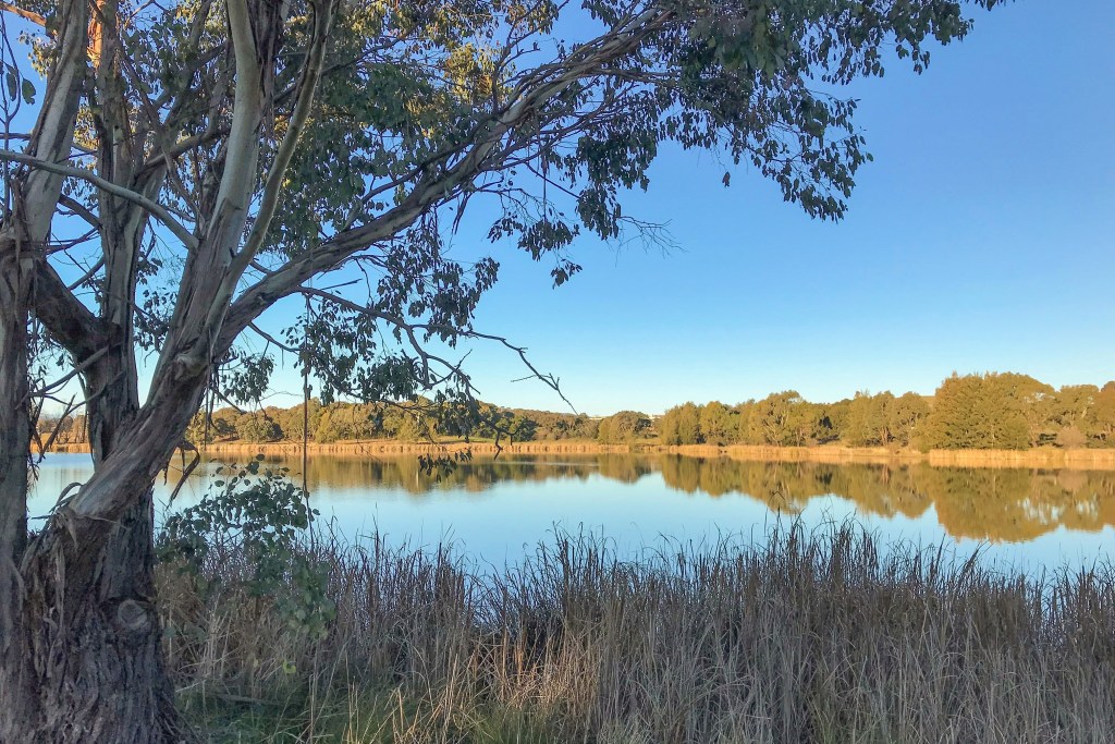 Spontaneity meant, of course, a little extra work. Like formulating a loop that would take in some non-trail trail as well as genuine trail trail. Fortunately, the non-trail trail link took me along one of the more scenic backdrops, bordering Lake Burley Griffin on its western shores. Here, away from the busy cycle lane, the area is fairly untrammelled, full of golden grassland and eucalyptus groves. Long reeds fringe the water and protrude into the lake, forming small headland sanctuaries for reptiles and birds. Among a cluster of trees, a wooden table offers coffee and contemplation with the fairy wrens.