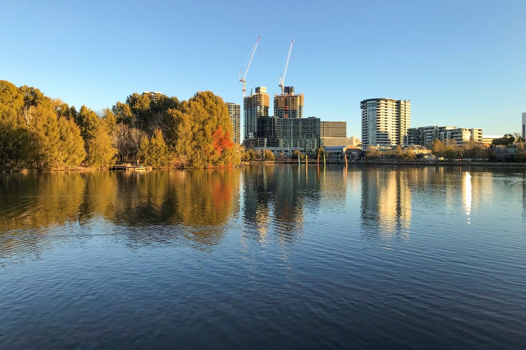 Dazzling in the still surface of the water, the high rises of Belconnen highlight the change that has taken place in the space of ten kilometres. The countryside of Hall is far behind and the Centenary Trail looks set to continue on through suburbs and closer again to the city. Indeed, that compass needle on Black Mountain, which has reassured and guided from a distance practically on every stage of this walk, feels within touching distance.