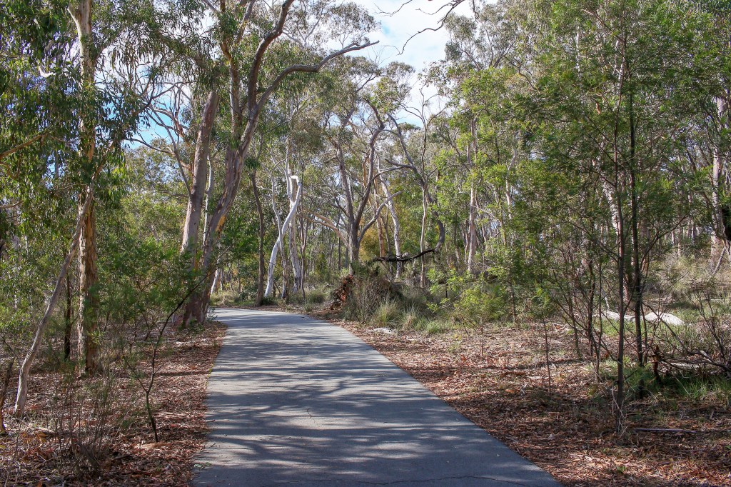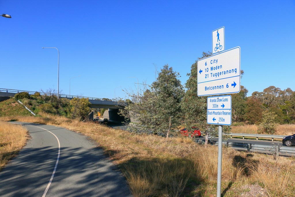 Australian suburbia re-emerges on another disappointing stretch of the trail next to a busy William Slim Drive. This one at least continues to follow a paved cycle lane but mystifies with other lanes branching off alluringly into parkland, none of which are to be followed. Nope, stay next to the road and enjoy the occasional Canberra roundabout.
