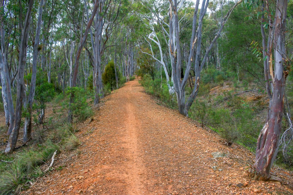 It is into some of this bush that the trail now descends, steeply at first and with a concerted period of zig-zagging. On flatter terrain, the trail is more comfortable, wider and well-groomed for leisurely cycling, with plenty of light penetrating the thin canopy of eucalyptus. It is, to some eyes, unremarkable, monotonous, dull even. But it is not a bitumen cycle lane adjacent to a busy trunk road, nor is it a concrete underpass leading to an electricity substation. It is the bush and be thankful for that.