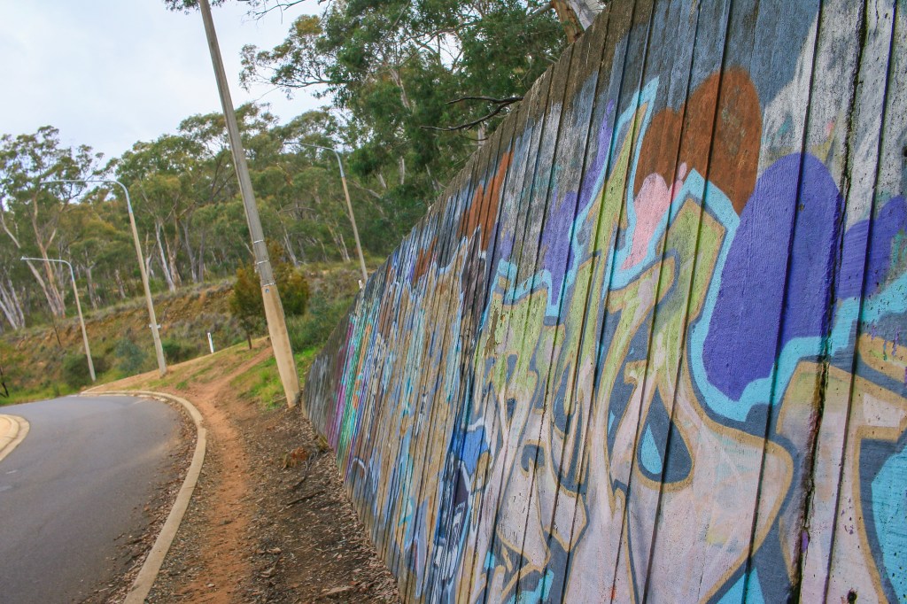 The route did little to intrude on the serenity of Inner North life for too long, instead heading into a surprising thin patch of scrub between the suburbs and Barry Drive. Strewth, what with Barry and Bruce in close proximity, this part of Canberra is so daggy. Trudging underneath a concrete tunnel decorated with street art, Alex and I no doubt looked the part too.
