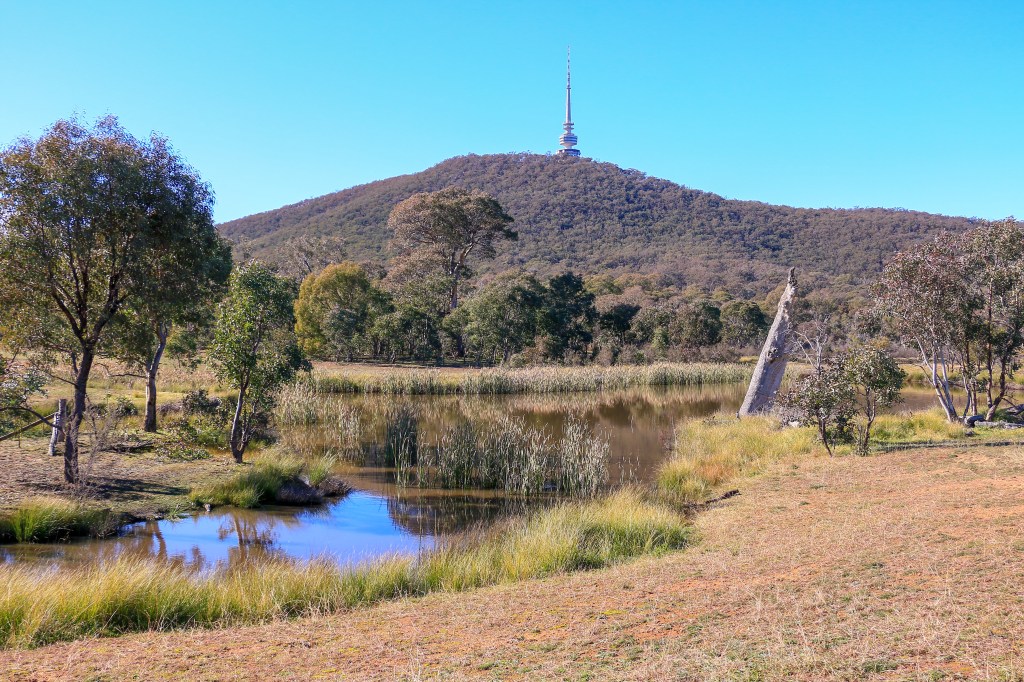 Approaching noon on a benign, sunny day, I am pleased that conditions are far from polar. Beyond the snow gums and a dead calm dam a car awaits in a parking spot beside Gungahlin Drive. I can’t quite see the car, hidden as it is among a clutch of trees. Trees which gather and rise to spread across the flanks and folds of Black Mountain, topped by that tower. The beautiful, enchanting, beguiling, menacing bush; host to an inescapable landmark, an enduring symbol of this walk.