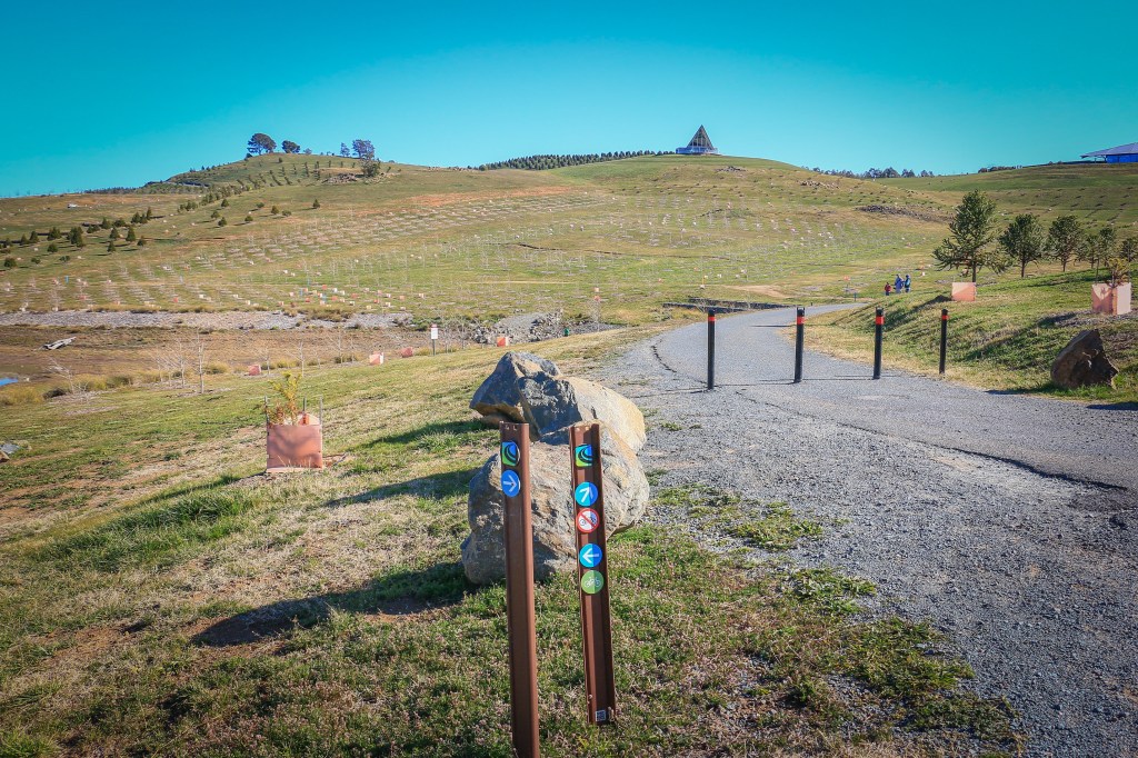 Yet that is to forget the Canberra Centenary Trail’s frequent propensity to take the stupid route and ignore the advantage of more scenic and amiable pathways. I get this at times since the trail – apart from walker only detours or extensions – is supposed to be suitable for cycling. But here most of the bikes I can see are heading up into the forest on a purpose built track. Even the young kid is back on her bike and giving it a go. From the forest you could pause at a viewing platform, take a nature break in the loos, have a selfie with the ‘Wide Brown Land’ sculpture, and easily carry on towards the visitor centre. But no, a dirt road shared with cars leading you to another junction.