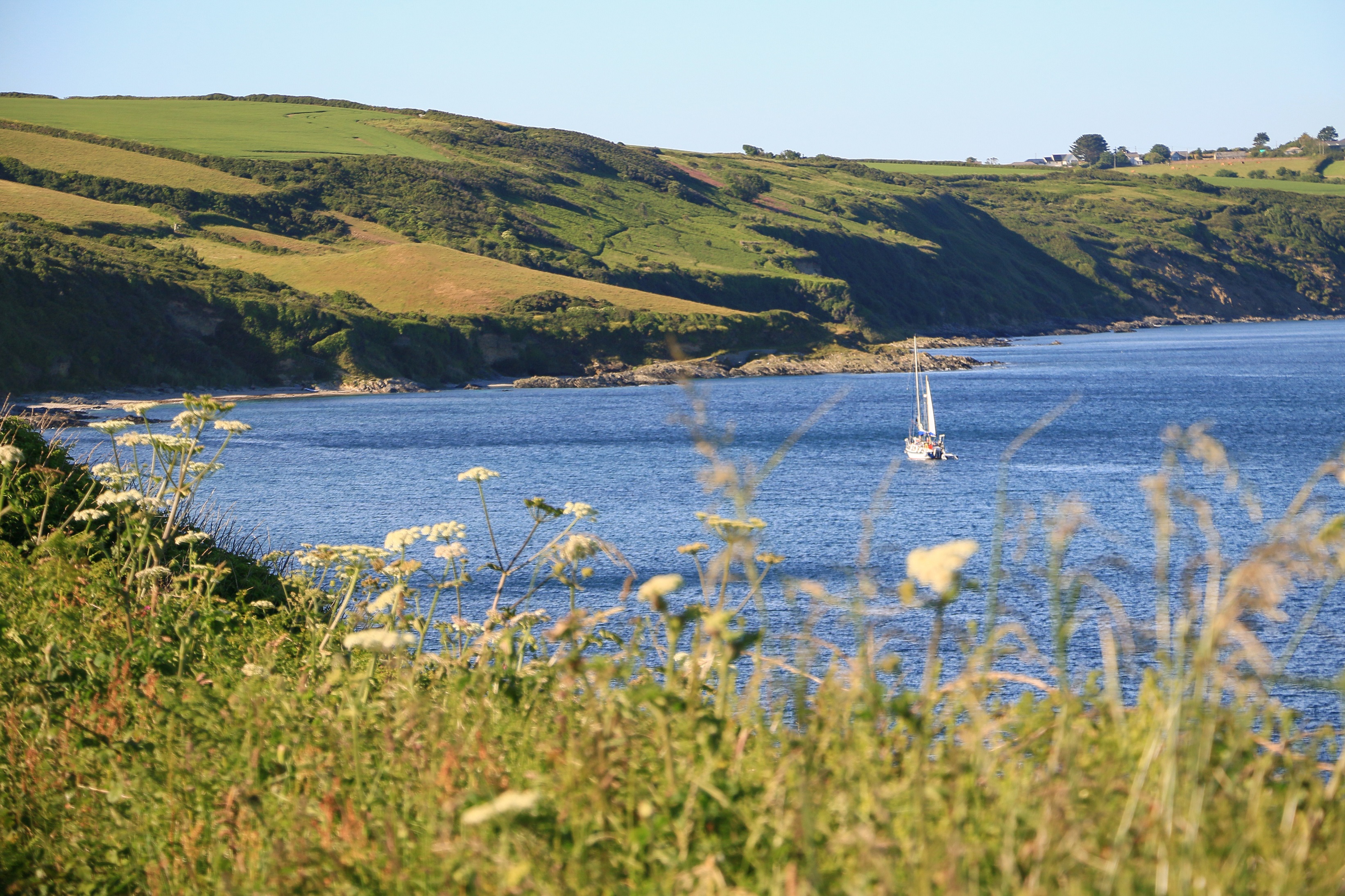 A yacht was dawdling not far out in the bay around Porthbean Beach, the coast path dropping down steeply to the stony shore and sharply up again. I wondered if the yachties, supping on their Prosecco in the golden light, were surveying the beauty of the coast. The flat sheen of water softly kissing the gentle bays, spilling over rocks and meeting the cliffs. The wooded shore, burgeoning green and decorated with sweet birdsong. The farmlands, dotted with sheep and cows, barns and wildflowers. And a sweaty oik gulping down some cheap cider.